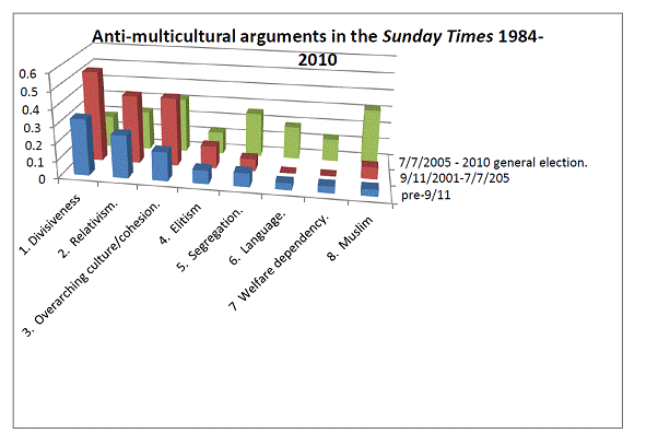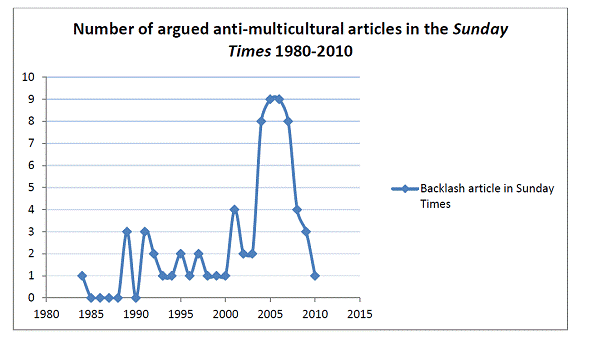 This section examines the backlash in the press against multiculturalism. This is currently based on quite a small sample of the press – all the material here is based on the Sunday Times and this is underpinned by material from the Observer and Guardian which I have not included here.[21]